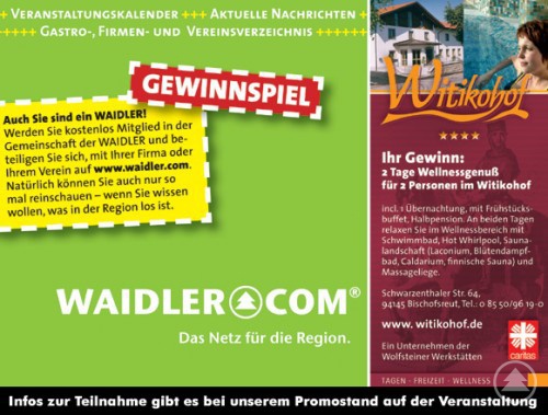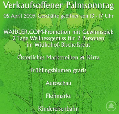 Außerdem sind auch wir von waidler.com diesmal live dabei beim verkaufsoffenen Palmsonntag in Grafenau. Bei unserem Promotionstand können Sie sich nicht nur ausführlich über unser online-Portal informieren, sondern auch kräftig abräumen! Wir verlosen einen zweitägigen Wellnessgenuss für zwei Personen im Witikohof, Bischofsreut. Dabei inbegriffen ist eine Übernachtung mit Frühstücksbuffet, Halbpension. An beiden Tagen relaxen Sie im Wellnessbereich mit Schwimmbad, Hot Whirlpool, Saunalandschaft (Laconium, Blütendampfbad, Caldarium, finnische Sauna) und Massageliegen.