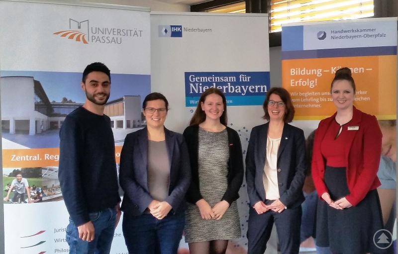 von links nach rechts: Mohamed Lolieh (Studierender an der Universität Passau), Luise Haack (Universität Passau), Tabea Schaarschmidt (HWK Niederbayern-Oberpfalz), Veronika Nagler (IHK Niederbayern), Claudia Blank (Jobcenter Passau Stadt)