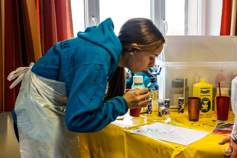 Bei der Kreativwerkstatt wurde es dann bunt: Mehrere verschiedene Maltechniken konnten getestet werden. Murmelbilder, Seifenblasengemälde und Faltbilder wurden erstellt, Farbe mit Wasserpistolen auf die Leinwand gespritzt oder mit Farbe gefüllte Ballons mit Pfeilen beworfen. Als krönender Abschluss folgte die Verschönerung der Maler-Overalls.