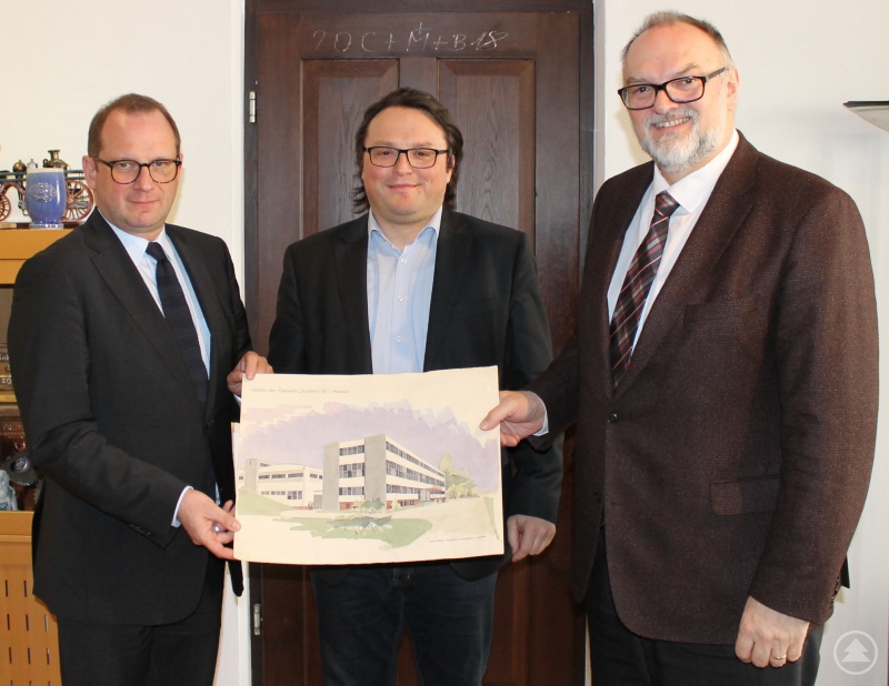 Passavia-Geschäftsführer Dominik Metzler (Mitte) übergibt das Aquarell des ehemaligen Passavia-Gebäudes in der Vornholzstraße an Oberbürgermeister Jürgen Dupper (rechts) und Kulturreferent Dr. Bernhard Forster. Es ist Teil der Schenkung an die Stadt Passau.