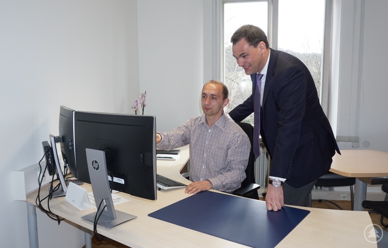 Der neue Büroleiter Josef Lenz (links) an seinem Arbeitsplatz zusammen mit Landrat Sebastian Gruber.