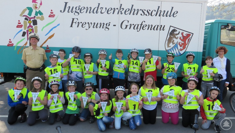 48 Schüler der Klassen 4a und 4b der Grundschulen Hinterschmiding und Grainet absolvierten zwei Wochen lang im April den Fahrradführerschein. Die Klassenlehrerinnen Anneliese Stadler und Elvira Hannig bereiteten ihre Schüler dabei im theoretischen Unterricht vor. Die praktischen Übungseinheiten machten die Grundschüler mit den beiden Verkehrserziehern der Polizei, PHK Erich Knab und PHK Werner Königseder, auf dem Verkehrsübungsplatz in der Freyunger Kaserne.