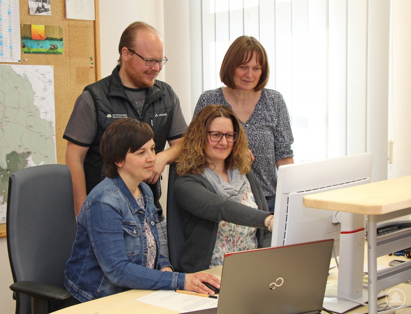 Eines der vielen Themen, mit dem sich das Presseteam derzeit befasst, ist die neue Konzeption der Homepage des Nationalparks. Über die vielen Ideen tauschen sich Annette Nigl (vorne v.l.), Sandra Schrönghammer, Elke Ohland und Gregor Wolf aus.