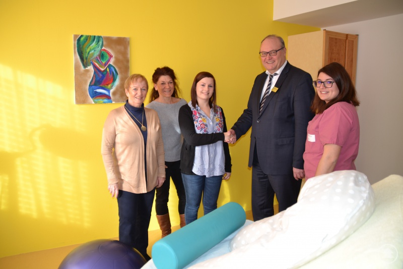 Von links: Die Hebammen Johanna Kopp und Michaela Schreib, die angehende Hebamme und Stipendiatin Julia Wamulla mit Geschäftsführer Helmut Denk, Hebamme Barbora Demkova