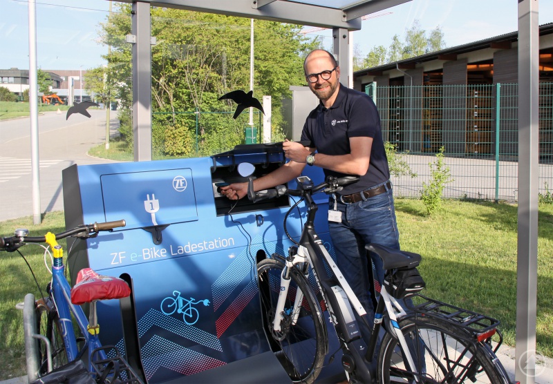 Helfen ZF bei der Verwirklichung der Vision Zero: Alexander Lenz, Leiter Werksanlagen, testet die neue Ladestation für Elektrofahrräder am Werk 2.