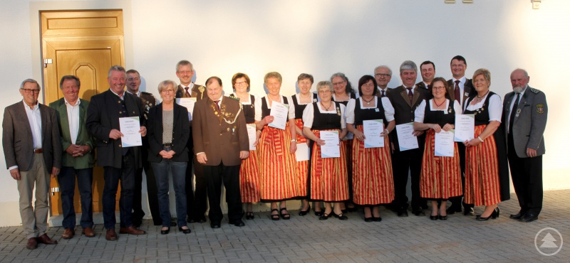 Danach hatte Stecher das Wort. Während Röhrl und Plötz die Ehrennadel und Urkunde überreichten, stellte er die zu Ehrenden vor. Los ging es mit zwei Ehrenzeichen in Gold. Die gingen an Annliese Geiger und Anna Wagner. Geiger ist seit 28 Jahren Kassenprüferin im Verein und seit 14 Jahren hilft sie im Schützenheim mit, Wagner ist seit 28 Jahren Kassiererin. Sie ist aber nicht nur in der Vorstandschaft tätig, sie hilft auch im Schützenheim mit. Zwei silberne Ehrenzeichen gingen an Walter Kollmer senior und Josef Kronschnabl. Kollmer ist Mitglied der Vorstandschaft, Jugendleiter und hilft im Schützenheim mit. Kronschnabl ist seit 2012 erster Schützenmeister, er war erster Gauschützenmeister und Gaujugendleiter und zweiter Schützenmeister. Neun bronzene Sportehrenzeichen wurden anschließen noch übergeben. Das erste Ehrenzeichen ging an Annemarie Rankl sie war viele Jahre Mitglied in der Vorstandschaft und hilft im Schützenhaus mit. Im Schützenhaus ist auch Marie Triendl aktiv, sie ist zudem Kassiererin und Mitglied der Vorstandschaft. Seit 15 Jahren ist Irene Nirschl im Vereinsheim im Einsatz und auch ihr Mann Walter Nirchl engagiert sich hier, er war zudem Ausschussmitglied. Marieluise Handlos war vier Jahre im Vereinsausschuss aktiv, heute hilft sie wie Helga Kollmer im Schützenhaus mit. Auch Kollmer war mehrere Jahre im Vereinsausschuss tätig. Manfred Seidl senior ist Vorstandsmitglied, Jugendleiter und Übungsleiter des Gaujugendkaders. Josef Waibinger war 13 Jahre Mitglied im Vereinsausschuss und zwei Jahre Waffenwart. Ingrid Zaglauer ist im Mitglied des Vereinsausschusses und seit 14 Jahren im Schützenhaus aktiv. Nicht anwesend sein konnte Michael Triendl senior. Er erhält ein silbernes Ehrenzeichen für zehnjährige Arbeit im Ausschuss. Zudem ist er seit 2003 im Schützenhaus im Einsatz.