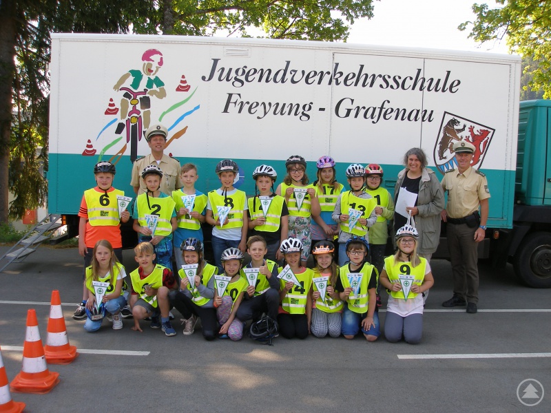 Insgesamt bestanden 16 Schüler die theoretische und praktische Prüfung zum Fahrradführerschein. 5 Teilnehmer erhielten dank sehr guter Leistungen sogar einen Ehrenwimpel. Diese JVS-Ausbildung wird unterstützt von der Kreisverkehrswacht Freyung-Grafenau und dem TÜV-Süd.