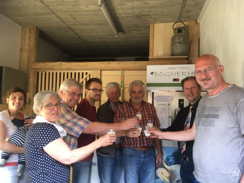 Neben dem Vorsitzenden der ILE Ilzer Land, Herrn Bürgermeister Eibl, waren auch weitere Bürgermeister sowie Dr. Carolin Pecho, die Geschäftsführerin der ILE, der Einladung des Projektmanagers auf den Bognerhof gefolgt. Dort konnten sie sich über die biologische Wirtschaftsweise und den am 1. Mai in Betrieb genommenen Milchautomaten am Biohof informieren. Auf die biologische Wirtschaftsweise umgestellt haben die „Bogners“ vor allem auch aufgrund des Engagements der Tochter Christina und ihrem Lebensgefährten Tobias, Landwirtin und beide Biologen. Die Familie bewirtschaftet den 30-Hektar Betrieb mit den 25 Milchkühen seit 2016 nach den Biorichtlinien des Naturlandverbandes. Auf die Frage von Bürgermeister Eibl, warum sie diese Milchtankstelle eingerichtet haben, erklärte Christina Putz: „Ich finde es gut, wenn der Verbraucher die Produkte wieder dort kaufen kann, wo sie produziert werden“.