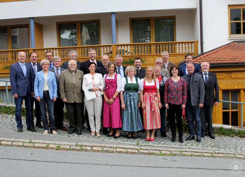 Die Geehrten mit Landrätin Rita Röhrl, den stellvertretenden Landräten Willi Killinger und Erich Muhr, den Bürgermeistern sowie Maria Dannerbauer (Landratsamt Regen).