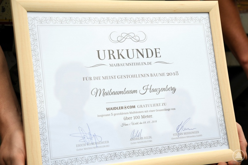 Natürlich gab es auch eine kleine Aufmerksamkeit vom Maibaumstehlen-Team: Feierlich überreichte Erich Rosenberger eine Urkunde.