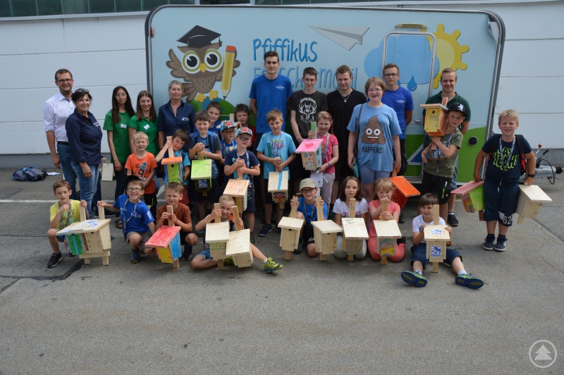 In der Lehrwerkstatt wurde es dann praktisch: Mit Unterstützung mehrerer Auszubildender konnten die Kinder ein Vogelhäuschen aus einem Bausatz zusammen schrauben. Bewaffnet mit Akkuschrauber und Hammer konnte die Herausforderung von allen gemeistert werden. Damit die Vogelhäuschen auch ein dekoratives Objekt für den Garten daheim abgeben, wurden sie zum Schluss noch schön verziert und bunt angemalt.