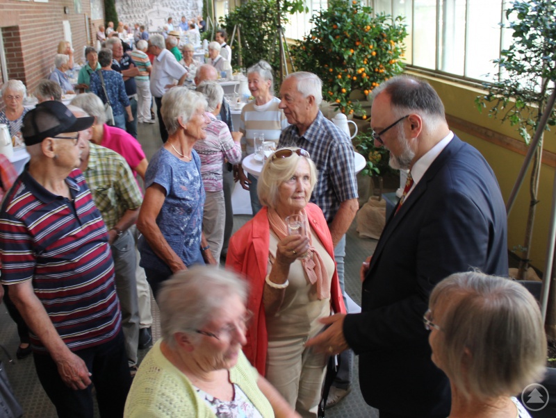 Oberbürgermeister Jürgen Dupper (rechts) im Gespräch mit den Seniorinnen und Senioren während der Kaffee-Pause in der Stadtgärtnerei.Oberbürgermeister Jürgen Dupper (rechts) im Gespräch mit den Seniorinnen und Senioren während der Kaffee-Pause in der Stadtgärtnerei.