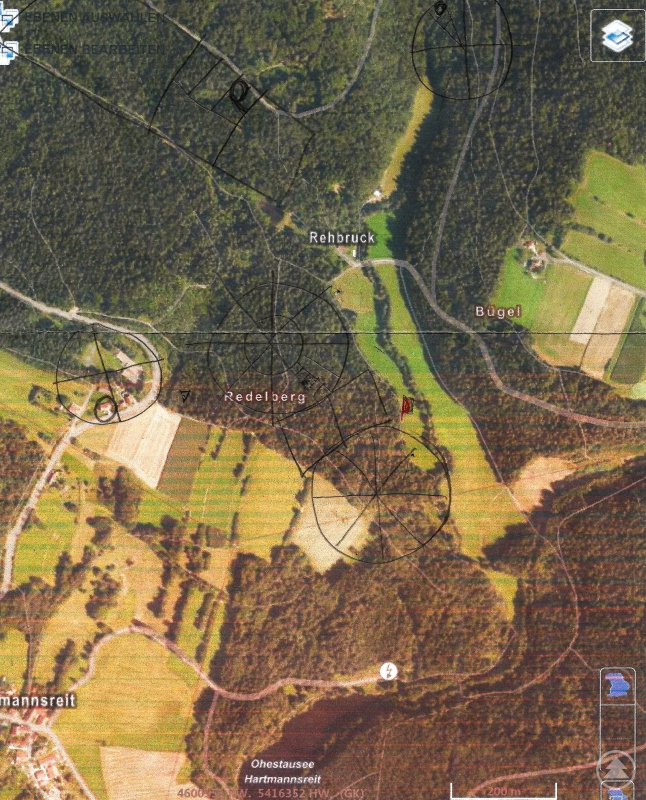 Rendlmoos im Tal der Großen Ohe - nahe dem Dorf Hartmannsreit mit dem Stausee. Es ist durch Quellen überliefert, dass bereits im Jahr 1580 im Auftrag des Grafen Christof von Schwarzenberg, Rentmeister (landesherrlicher oder kirchlicher Finanzverwalter) Christof Nusser und Landrichter Gartner von Bärnstein ein Stollen in den Redelberg getrieben wurde, um nach Gold, Silber, Kupfer und Blei zu suchen. Die ersten beiden Personen sahen nach vielen vergeblichen Versuchen von weiteren Grabungen ab, nur der Landrichter ließ nicht ab. Er soll den Bergbau bis ins Jahr 1600 fortgeführt haben. Danach versuchten noch die Grafen von Viehböck ihr Glück, bis auch sie ihr Engagement - wohl aufgrund fehlender Erfolge - einstellten.