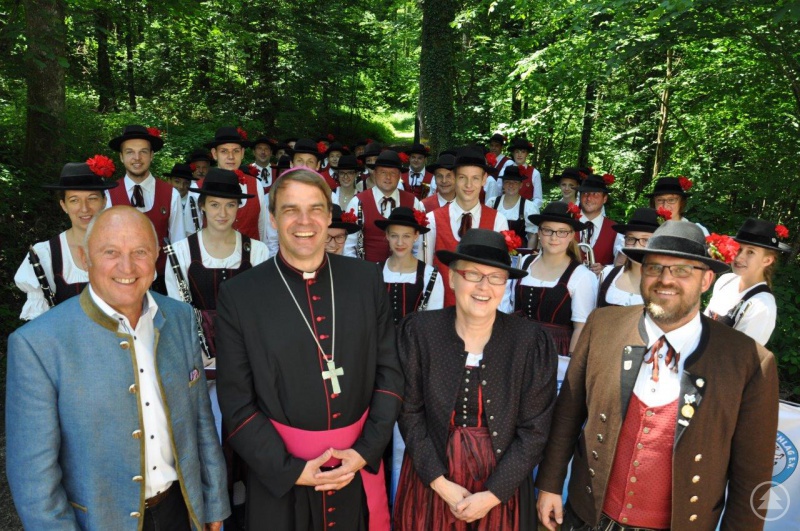 Bischof Stefan Oster mit der Blaskapelle Schlag bei der Einweihung der renovierten Brudersbrunn-Kapelle (v. l.: Edi Hable, Bischof Oster, Johanna Maier-Simmet, Robert Maier)