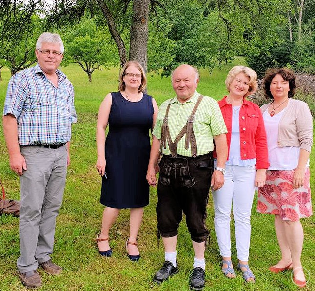 Direkt neben dem denkmalgeschützten Gebäude befindet sich der rund 1,5 Hektar große Obstlehrgarten mit 160 verschiedenen Obstsorten. Hier finden Obstbaumschnitt- und Veredelungskurse statt und natürlich ist ein Ziel der Erhalt der älteren Obstsorten. Ruth Müller freute sich als imkereipolitische Sprecherin der SPD-Landtagsfraktion besonders über das Bienenschauhaus inmitten der Streuobstwiese. "Hier wird das Zusammenspiel zwischen Bienen und Blüte für jeden anschaulich erklärt. Ohne Bienen sähen die Ernten bei Äpfeln und Birnen ganz anders aus", so Ruth Müller. Es sei immens wichtig, für die ehrenamtlichen Imkerinnen und Imker Fortbildungsmöglichkeiten vor Ort anzubieten und auch die Kinder, die den Lehrgarten besuchen, lernen wichtige Zusammenhänge der Natur kennen und verstehen, lobte Müller das Engagement für die Imkerei auf dem Kräuterhof.
