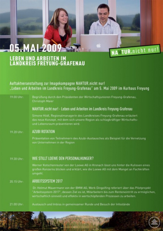 Am 05. Mai 2009 veranstaltet das Regionalmanagement Freyung-Grafenau in Zusammenarbeit mit den Wirtschaftsjunioren des Landkreises und dem Arbeitskreis SCHULEWIRTSCHAFT eine Auftaktveranstaltung zur Imagekampagne NAHTUR.nicht nur! „Leben und Arbeiten im Landkreis Freyung-Grafenau“.
