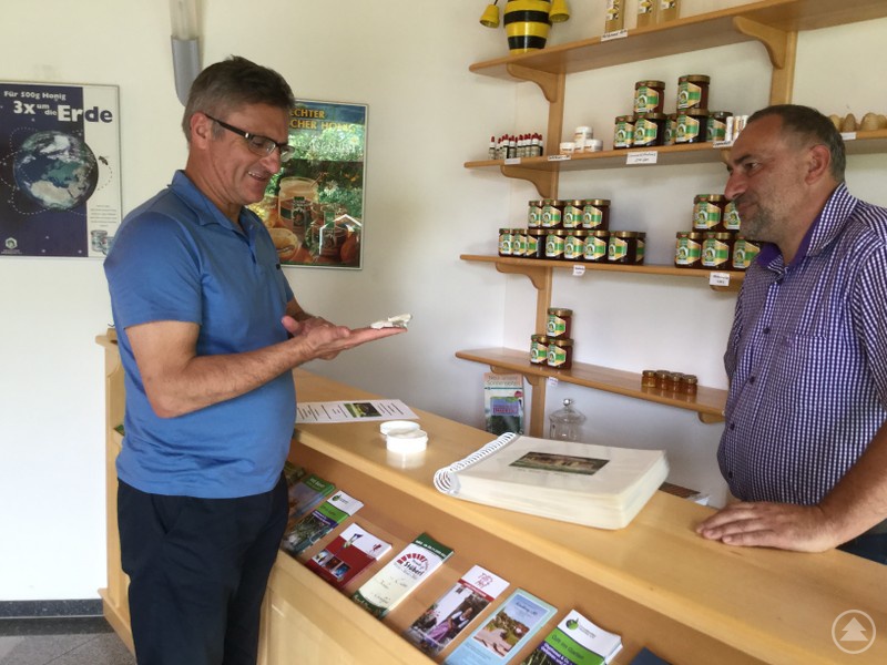 Landtagsabgeordneter Alexander Muthmann informiert sich im „Haus der Bienen“ über die Angebote der Imker im Landkreis Regen. Franz Rothkopf ist ihr Vorsitzender.