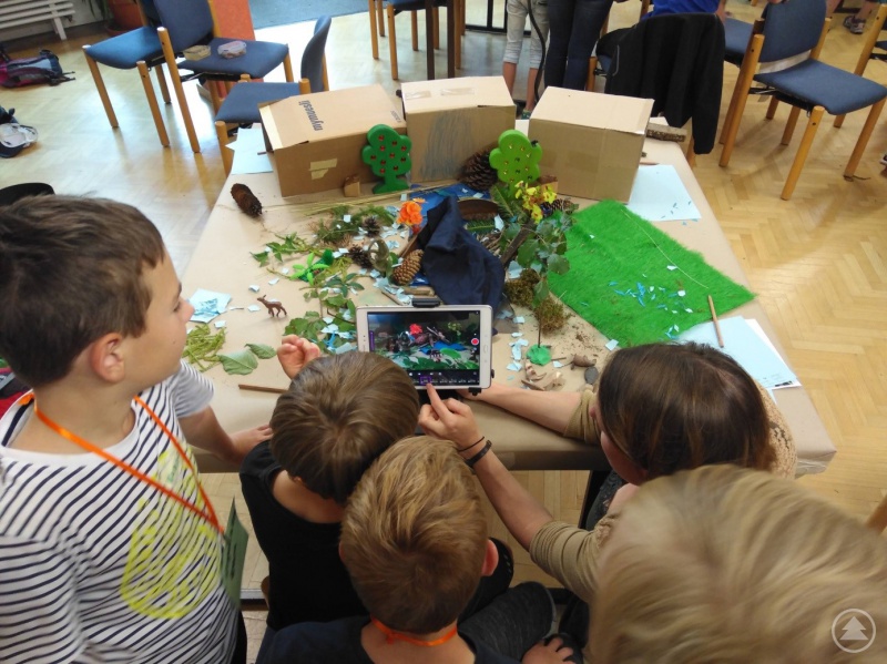 Natürliche Materialen wie Blätter und Zapfen wurden als Kulisse für die Trickfilme von den Kindern verwendet.Natürliche Materialen wie Blätter und Zapfen wurden als Kulisse für die Trickfilme von den Kindern verwendet.