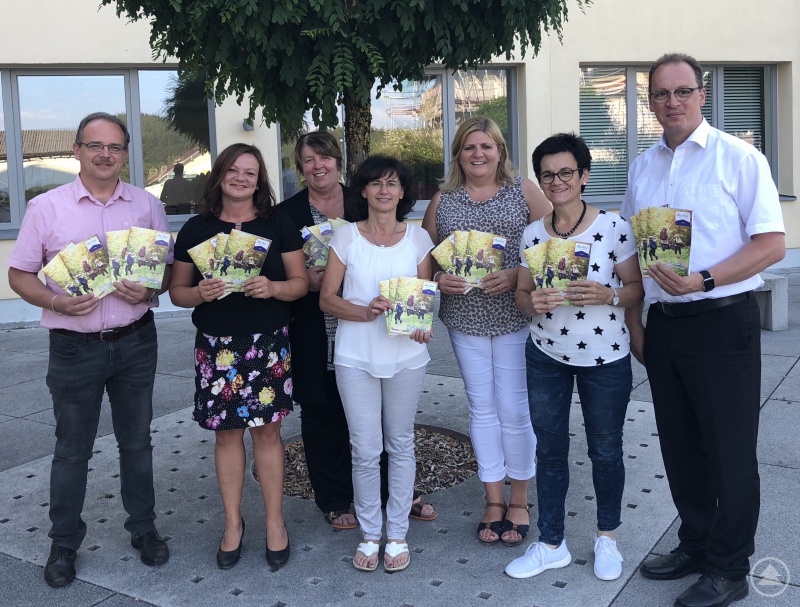 Die beiden Bürgermeister, die für das Jugendnetzwerk verantwortlich sind, Christian Süß (l.) und Martin Behringer (r.), freuen sich zusammen mit den Jugend-Beauftragten der Ilzer Land Gemeinden über den neuen Ferienkalender.