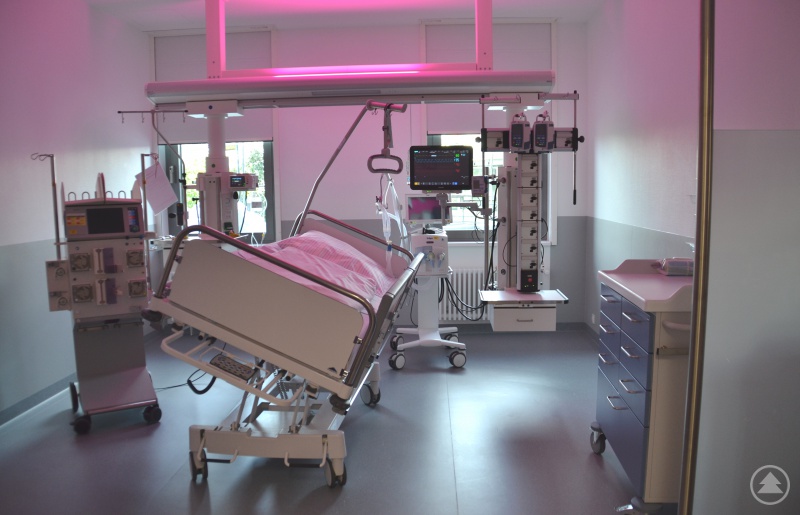 Intensivstation: Fläche 724 m², Deckenbalkensystem für die 14 Bettplätze, Infusionsmanagementsystem je Bett, Neue Zentrale für das Patientenmonitoring