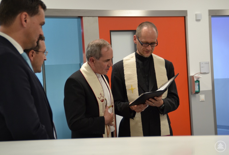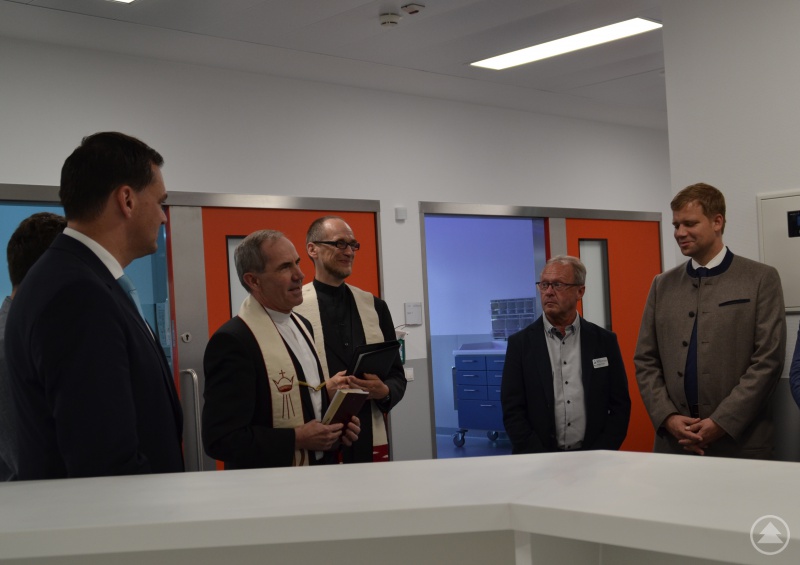 Nach den Festreden lud Landrat Gruber alle Gäste sehr herzlich zur Segnung und anschließender Besichtigung der neuen Räumlichkeiten ein. Im Bereich der Zentrale mit Patientenmonitoring auf der Intensivstation erteilten die beiden Pfarrer Magnus König, Katholisches Pfarramt und Thomas Weinmair von der Evangelischen Kirchengemeinde den kirchlichen Segen. Pfarrer König verglich das Krankenhaus mit einer Oase in der Wüste. In einem Krankenhaus sind so viele Menschen, die Ihre Zeit und Liebe geben für die Kranken. Sie sind ein Brunnen, der Hilfe spendet.
