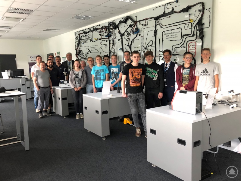 Schulleiter Günter Schwarzbauer (6. von links), Komax SLE-Personalleiterin Helga Haydn (8. von links), die Ausbilder von Komax SLE (links), Regionalmanager Stefan Schuster (3. von rechts) und die teilnehmenden Praktikant(inn)en.
