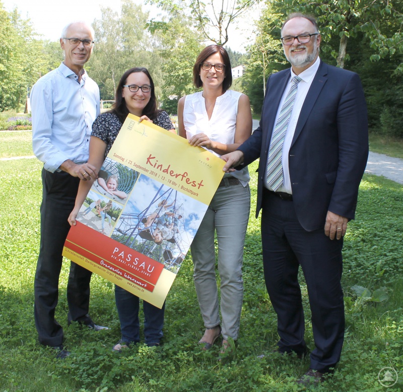 Freuen sich auf viele Besucher beim diesjährigen Kinderfest im Bschüttpark: Oberbürgermeister Jürgen Dupper (von rechts), Astrid Engl (Dienststelle Arbeit und Qualifizierung, Ehrenamt und Senioren), Karin Meyer (Stadtjugendring) und Jugendamtsleiter Alois Kriegl.