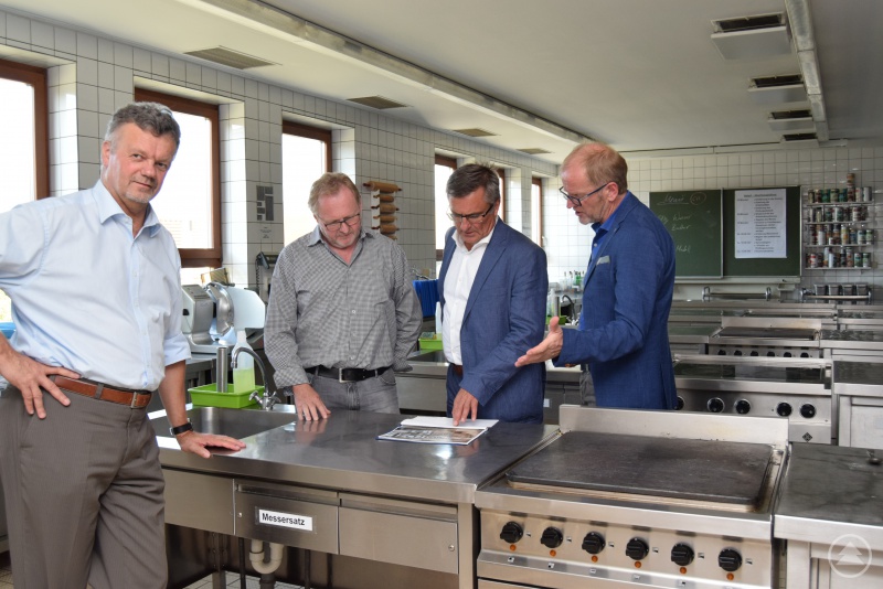 Sie begutachten die Pläne für die neuen Küchen: (von links) Schulleiter Peter Oswald, Fachpraxisleiter Johann Stubenrauch, MdL Alexander Muthmann und Außenstellenleiter Xaver Dietrich.