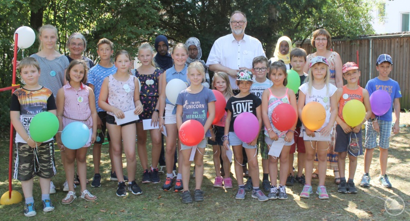 Oberbürgermeister Jürgen Dupper (hinten, Mitte) freut sich mit Maria Höltl vom Stadtjugendring (4. von links), Anita Bauer vom Jugendamt (3. von rechts) und den Kindern, dass das Spielmobil auch heuer wieder im Stadtgebiet im Einsatz ist.