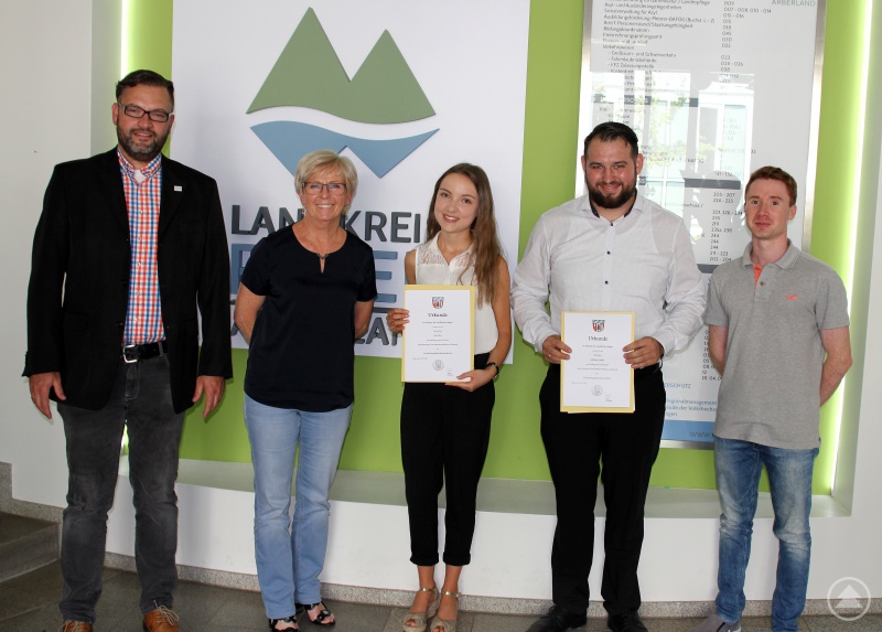 „Der Landkreis Regen wird ab 1. September zwei neue Auszubildende beschäftigen“, weiß sie und nun haben die beiden neuen Kräfte ihre Ernennungsurkunden von ihr überreicht bekommen. Rita Röhrl ernannte, mit Wirkung ab 1. September, Pia Fürst zur Verwaltungssekretäranwärterin und Michael Hackl zum Verwaltungssekretäranwärter. Beide werden am Montag, 3. September, ihre Verwaltungsausbildung im Landratsamt Regen starten, und beide sagten, dass sie sich auf ihre Ausbildungszeit schon sehr freuen. Dabei haben sie unterschiedliche Ausgangslagen, Fürst beginnt direkt nach der Realschule ihre Ausbildung, hinter Hackl liegen zuletzt elf Jahre bei der Bundeswehr. Neben der Ausbildung im Amt werden beide die Bayerische Verwaltungsschule in Landshut besuchen. Begrüßt wurden die neuen Auszubildenden auch vom Personalchef Andreas Koneberg und Michael Fenzl vom Personalrat.