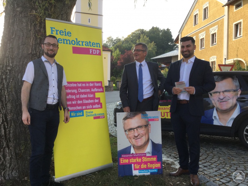 Kirchdorf im Wald. „Eine starke Stimme für die Region!“ Mit diesem Slogan bewirbt sich der Freyunger Landtagsabgeordnete Alexander Muthmann bei der Wahl am 14. Oktober 2018 erneut um einen Platz im bayerischen Parlament. Der offizielle Wahlkampfauftakt der FDP im Stimmkreis Freyung-Regen fand am Donnerstagabend in Kirchdorf im Wald statt. Muthmann wollte damit ein Signal setzen, dass ihm der Landkreis Regen wichtig ist und er in München auch dessen Anwalt sein will, denn mit dem Ausscheiden von Helmut Brunner aus der Landespolitik verliere Regen einen wichtigen Fürsprecher. Mathias Baur, der Kreisvorsitzende der FDP im Landkreis Regen, und Al-Halak Muhanad, Abwassermeister bei der Stadt Grafenau, stellten sich bei dem Termin in Kirchdorf als Kandidaten für den Bezirkstag vor, der eine direkt, der andere auf der Liste.