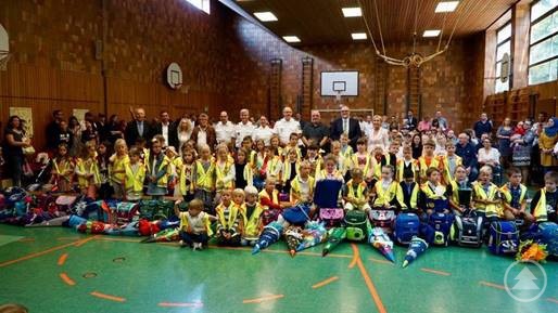 Bevor die Erstklässler von ihren Klassenlehrerinnen in Empfang genommen wurden, erhielten sie zur Erhöhung der Erkennbarkeit auf ihrem Schulweg gelbe Reflektorwesten von der ADAC Stiftung.