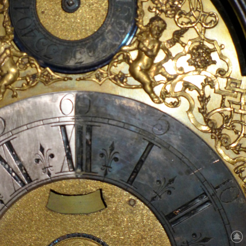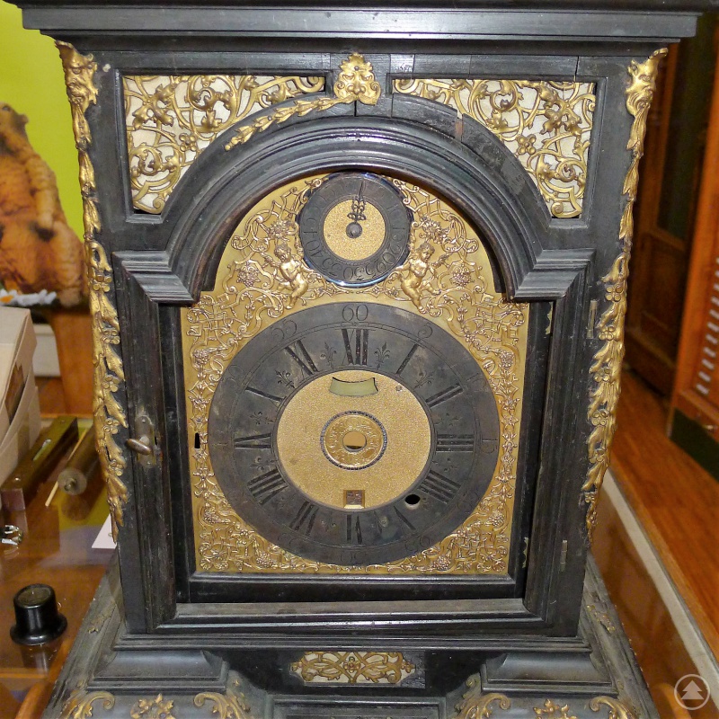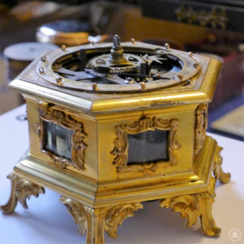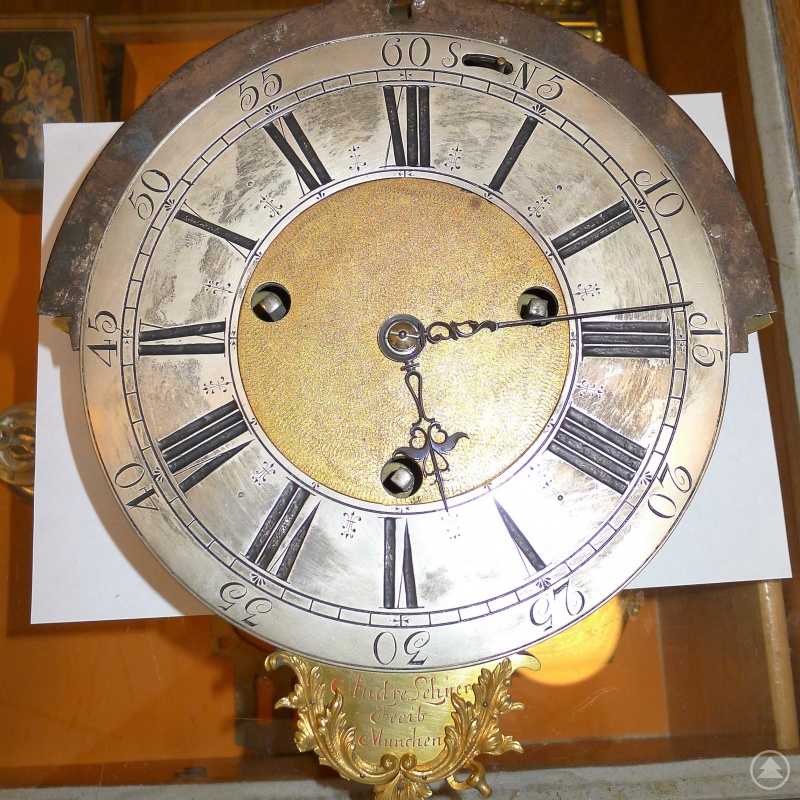 Tischuhrwerk von Andreas Lehner, Hofuhrmacher bei Kurfürst Karl Albrecht von Bayern 1730, 4/4 Schlagwerk mit Scherenpendel.