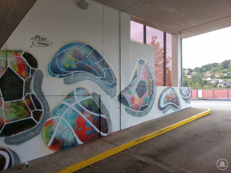 Die Ballmotive passten sich der Wand mit ihren Versprüngen und Unebenheiten perfekt an. Die Jugendlichen nutzen damit den Untergrund, den sie vorfanden und verwandelten ihn in scheinbar bewegte Bilder. Aber nicht nur Fußbälle wurden an die Wand gesprayt, auch Basketbälle und Bälle und ein Helm aus dem American Football finden sich an der Wand wieder. Die Fangemeinde der Sportart wächst in der Region seit Jahren stetig und so schlugen die Jugendlichen vor, auch diese Ballarten dort aufzubringen. Während es dabei sehr bunte Farbfelder gibt, zeigte Heindl den angehenden Sprayern auch, wie sie mit schwarzer Farbe Konturen ziehen können, die die Bilder noch plastischer machen. Gleiches galt für weiße Felder, die er ebenfalls gezielt einsetzte, um den Bildern Tiefe zu geben. Während er ihnen zur Hand ging, lief es für die Jugendlichen immer flüssiger und die vier Stunden, die für den Workshop angesetzt waren, verflogen fast. Während die Schule nun bereits wieder begonnen hat, können sich die Jugendlichen anhand des Abdrucks, den sie dort hinterlassen haben, immer noch über das gelungene Ferienevent freuen.
