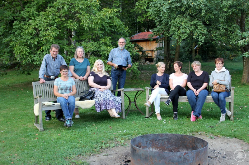 Der Garten der Familie Stoksa ist sehr groß, da bietet sich bei der Besichtigung eine Rast am Lagerfeuerplatz an, im Bild, sitzend v.li.: Jakobine Tremml, Bürgermeisterin Josefa Schmid, Monika Gehr, Brigitta Müller, Veronika Reiner und Mariele Klingl; stehend v.li. Helmut und Ursula Stoksa und Klaus Eder.