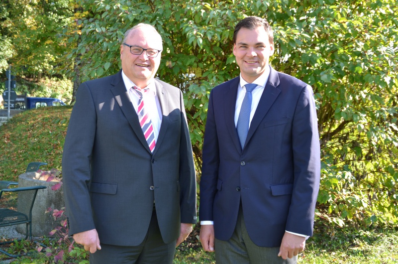 Der scheidende Geschäftsführer der Kliniken Am Goldenen Steig gGmbH Helmut Denk mit Landrat Sebastian Gruber. Das Foto entstand bei der letzten gemeinsamen Aufsichtsratssitzung.