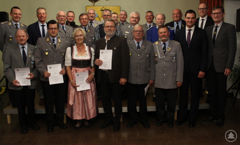 22 verdiente Ehrenamtliche erhielten die Ehrenamtsnadel des Landkreises aus den Händen von Landrat Gruber (3.v.r.). Mit auf dem Bild Richard Drexl, Präsident des Bayerischen Soldatenbundes (rechts), Dietmar Attenbrunner von der Sparkasse Freyung-Grafenau (daneben), Kommandeur Matthias Blaesing (hinten links).