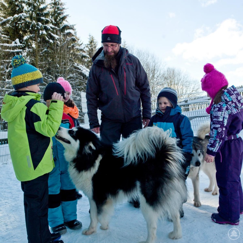 Wir haben sowohl Gäste, die in unserer Pension für einige Tage Urlaub machen, wie auch Tagesgäste. Im Winter bzw. wenn Schnee liegt bieten wir einen ca. dreistündigen Workshop an. Da kann man in das Schlittenhundefahren mal reinschnuppern. Zunächst schiebt man mal den Schlitten, am Ende darf man auf dem von uns extra angelegten, etwa 600 m langen und gespurten Rundkurs auf unserem Grundstück auch mal einen Schlitten selbst steuern. Im Herbst kann man mitfahren, wenn ich mit dem Schlitten auf Rädern unterwegs bin. Im Sommer kann man jeweils montags die Huskys besuchen, sie fotografieren und sie knuddeln. Dienstags unternehmen wir immer eine Wanderung, beispielsweise zur Mammuttanne. Jedes Kind, gekoppelt mit einem Elternteil, ist dann an einen Schlittenhund angeleint. Außerdem veranstalten wir Kindercamps für Interessierte ab acht Jahren. Da besteht auch wieder viel Kontakt zu den Hunden, aber auch zu den Pferden meiner Frau, wir organisieren eine Schatzsuche. Wir schlafen alle in einem Tipi.