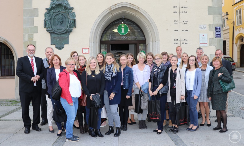 Oberbürgermeister Jürgen Dupper (1. v. links) mit Werner Grabl (2. v. links) und Frieda Dollinger (1. v. rechts) im Kreis der Rektorinnen der Grund- und Mittelschulen der Stadt Passau und der neuen Lehrkräfte im Schulamtsbereich sowie Vertretern der Stadtverwaltung.