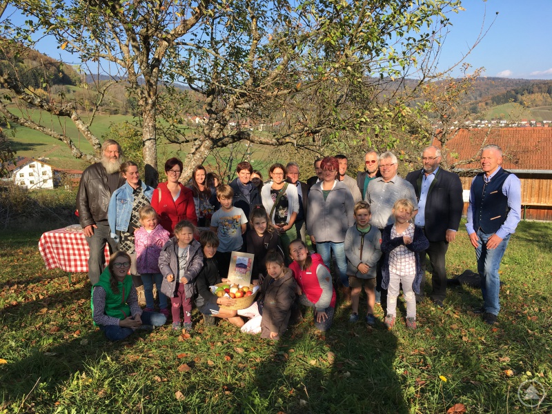 Engagierte „Streuobstsafttrinker“ in der wunderbaren Kulturlandschaft in Eckertsreut: Bürgermeister, Schul- und Kindergartenleiterinnen, Umwelt und Naturschützer, Kinder und deren ElternEngagierte „Streuobstsafttrinker“ in der wunderbaren Kulturlandschaft in Eckertsreut: Bürgermeister, Schul- und Kindergartenleiterinnen, Umwelt und Naturschützer, Kinder und deren Eltern