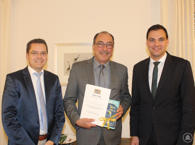 Herzlich gratulierten Landrat Sebastian Gruber (rechts) und Bürgermeister Heinz Pollak (links) Franz Brunner zu dessen Auszeichnung mit der Dankurkunde für besondere Verdienste um die kommunale Selbstverwaltung.