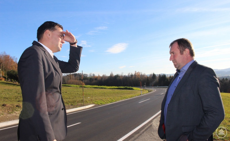 Ein frisches schwarzes Teerband zieht sich durch Kaltwasser (Gemeinde Jandelsbrunn), sehr zur Zufriedenheit von Landrat Sebastian Gruber (links) und Bürgermeister Roland Freund, die die abgeschlossene Baumaßnahme vor Ort besichtigten und eine positives Fazit zogen.