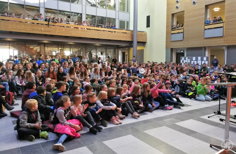 „Schockier deine Eltern – lies ein Buch!“ Mit diesem Aufruf appellierte OStDin Barbara Zethner an die jungen Leute, sich fürs Lesen zu begeistern, als sie zum Auftakt des Weltvorlesetags hunderte junge Zuhörer in der Aula des Freyunger Gymnasiums begrüßte. Der Einladung zum Weltvorlesetag waren nicht nur gut 500 Schülerinnen und Schüler des Gymnasiums selbst gefolgt, sondern auch die Klassen 3a und 3b sowie die Klassen 4a und 4b der Grundschule am Schloss Wolfstein mit ihren Klassenleiterinnen.
