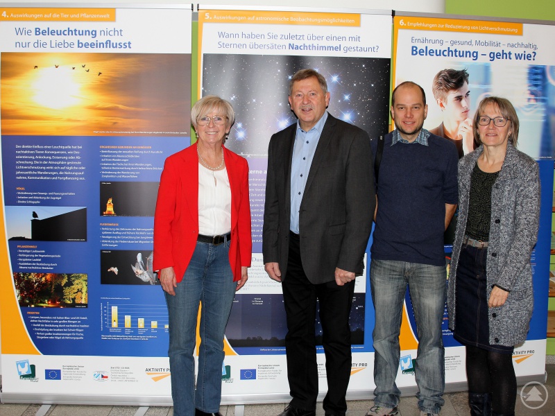 Sie freuen sich, dass die Ausstellung im Landratsamt Regen zu Gast ist, v.li.:  Landrätin Rita Röhrl, Heinrich Schmidt (Vorsitzender des Naturparks Bayerischer Wald), Johannes Matt (Koordinator des Naturparkprojekts Lichtverschmutzung) und Rosemarie Wagenstaller (Landkreis Regen).Sie freuen sich, dass die Ausstellung im Landratsamt Regen zu Gast ist, v.li.: Landrätin Rita Röhrl, Heinrich Schmidt (Vorsitzender des Naturparks Bayerischer Wald), Johannes Matt (Koordinator des Naturparkprojekts Lichtverschmutzung) und Rosemarie Wagenstaller (Landkreis Regen).