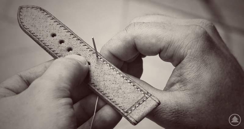 Wenn die richtige Lederauswahl getroffen ist und ich die Wunschmaße meines Kunden habe, dann schneide ich zuerst einmal das Leder in Streifenform. Selbstverständlich verwende ich auch hier alte Sattlermesser, da man diese im Vergleich zu neuen Billigmessern noch vernünftig schärfen kann. Mit stumpfen Messern kann man bei diesem Handwerk sehr wenig anfangen. Im nächsten Arbeitsschritt werden die Lederstreifen verklebt. Meine Bänder haben danach je nach gewünschter Banddicke und Lederauswahl zwei bis drei Lagen. Aal- oder Froschleder mit einer Stärke von weniger als einem Millimeter benötigt beispielsweise eine zusätzliche Lederschicht. Nach dem Verkleben werden die Bänder zur endgültigen Form zurechtgeschnitten und die Ränder geschliffen. Anschließend wird die Naht mit einem alten Prickrad markiert und die Nahtlöcher gestanzt. Genäht wird dann selbstverständlich von Hand mit zwei Nadeln, um dem traditionellen Sattlerhandwerk gerecht zu werden. Am Schluss werden die Ränder des Bandes poliert und das Band mit Lederfett versiegelt.
