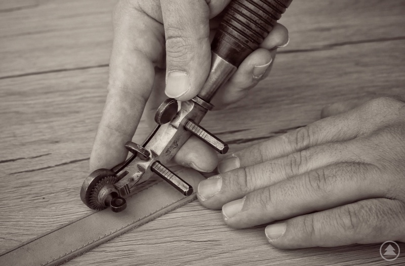 Zum Sattlerhandwerk bin ich eher durch Zufall gekommen. Um etwas weiter auszuholen: Ich interessiere mich generell für alles was alt ist und irgendwann vor vielen Jahren sehr hochwertig produziert wurde. Diese Leidenschaft habe ich vermutlich meinem Vater zu verdanken, mit dem ich schon in jungen Jahren alte Traktoren, Motorräder usw. restauriert habe. Hier habe ich natürlich auch einige Grundkenntnisse der Metallbearbeitung erworben und kann daher auch einigermaßen gut mit Drehbank und Fräsmaschine umgehen. Auf einem Flohmarkt habe ich dann einmal eine alte Schweizer Magazintasche aus dem zweiten Weltkrieg gefunden. Da die Nähte der Tasche sowieso schon halb kaputt waren, habe ich den Flohmarktfund zerschnitten und im Internet recherchiert, was man denn alles aus Leder machen könnte und klein genug ist, damit mir mein Lederstück der alten Tasche reicht. Die Idee für mein erstes Uhrenarmband war also geboren. Montiert hatte ich dieses anfangs natürlich an einer nicht gerade wertvollen Modeuhr. Der Herstellungsprozess des ersten Bandes war so interessant, dass ich kurz darauf nach neuem Material suchte und mir ein guter Freund einige alte, nicht mehr brauchbare Militärtaschen zur Verfügung stellte. Schnell war klar, dass mir ein Küchenmesser und eine Nähnadel aus dem Nähkästchen meiner Mutter nicht mehr ausreichen, um meinem neu gewonnenen Hobby nachzugehen. Leider sind alte Sattlerwerkzeuge jedoch nicht einfach zu bekommen und wenn, dann nur zu hohen Sammlerpreisen. Aus diesem Grund musste ich mir erst einmal diverse Lederwerkzeuge herstellen. Nun konnte ich also auch von meinen Kenntnissen über die Metallverarbeitung profitieren. Eine Maschine zum Ausdünnen von Leder, einen Riemenschneider und diverse Ahlen (Werkzeug zum Stechen und Weiten von Löchern, Anm. der Red.) habe ich mir also zu Beginn selbst gebaut. Nach und nach habe ich dann meine Sattlerausstattung um seltene, alte Sattlerwerkzeuge erweitert.