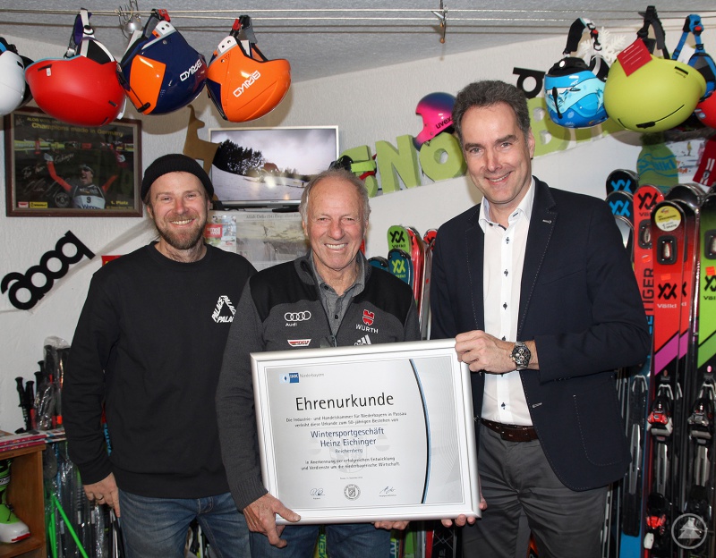 Mit einer Ehrenurkunde hat die IHK Niederbayern dem Sportgeschäft Eichinger in Reichenberg bei Riedlhütte zum 50-jährigen Bestehen gratuliert. IHK-Hauptgeschäftsführer Alexander Schreiner überreichte die Urkunde vor Kurzem bei einem Besuch im Betrieb an Gründer Heinz Eichinger und seinen Sohn Heinz Eichinger junior. Schreiner würdigte dabei die wirtschaftliche Aufbauleistung, die sportlichen Erfolge des zehnmaligen Ski-Bayerwaldmeisters Heinz Eichinger sowie das große Engagement für die Ausbildung des Ski-Nachwuchses. Letzteres kann Schreiner gut beurteilen, denn er hatte selbst in jungen Jahren auf dem Eichinger-Hang sein Skifahren weiterentwickelt.