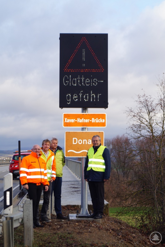 Nicht nur die Salzlager im Landkreis sind aufgefüllt und bereit für weitere Kälte- und Niederschlagstage – auf der Xaver-Hafner-Brücke bei Bogen auf der Kreisstraße SR 22 gibt es seit kurzem für die Verkehrsteilnehmer eine Neuerung: Eine sogenannte Wechselverkehrszeichenanlage jeweils am Brückenanfang und –ende – bestehend aus zwei LED-Tafeln – warnt die Verkehrsteilnehmer bei Glatteisgefahr. „In anderen Bereichen wurden damit sehr gute Erfahrungen gemacht, was die Absenkung der Geschwindigkeit und die Vermeidung von Unfallgefahr betrifft“, erklärt Markus Fischer den Grund der rund 13.000 Euro teuren Anschaffung. Ab einer Temperatur von unter 4 Grad Celsius werden die Tafeln mittels eines Sensors aktiviert. Dann zeigt sich im oberen Bereich ein Warndreieck mit Ausrufezeichen und im unteren Bereich wechselt die Darstellung zwischen dem Schriftzug „Glatteisgefahr“ und der klassischen Schneeflocke. „Damit wird deutlich gemacht, dass gerade im Brückenbereich bzw. im Bereich oberhalb der Donau mit winterlichen Gegebenheiten zu rechnen ist“, erläutert der Tiefbauamtschef.