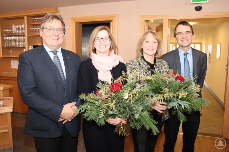 Caritas im Wandel. Bischöflicher Beauftragter, Diakon Konrad Niederländer (li.) und Caritasdirektor Michael Endres (re.) sagen Brigitte Lengdobler (2.v.re.) herzlichen Dank für den großen Einsatz und wünschen Astrid Wegerbauer (2.v.li.) alles Gute für den Start als Abteilungsleiterin Behindertenhilfe/Psychiatrie.