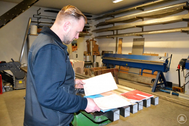 Ich nehme eine Stahlblechplatte und reiße darauf die Form der Glocke ab. Diese Form schneide ich dann mit der Flex aus. Es folgt das Biegen und Aufstellen der Seitenwände. Dieses Gebilde schraube ich dann an der Werkbank fest und stelle das Blech um die Längsachse auf. Dann verniete ich den Glockenkörper. Den Glockenschwengel fertige ich aus Eisenrundstahl, der Bommel wird aufgeschweißt. Am Ende wird die Glocke noch galvanisch gelb-verzinkt. Das macht optisch mehr her und dient dem Schutz vor Rost.